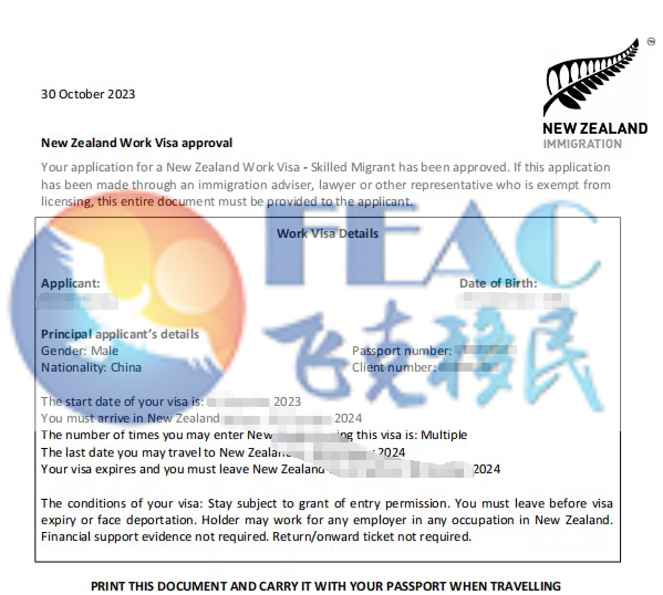10月30日:恭喜Mr.Li??新西蘭技術(shù)移民工作簽證成功下簽!