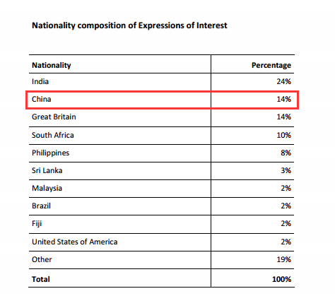 5. 受邀者中持有中國國籍的占14%,在EOI遞交國家中與英國并列第二,排名較上次上升一名,可以看出中國仍然是新西蘭技術(shù)移民申請(qǐng)的主要來源國!