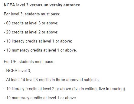 目前,新西蘭的學生想上大學必須具備如下條件:NCEA考試中 level 3中至少3門認證科目中獲得14個學分,leve 2或以上的科目中獲得10個讀寫能力學分,leve 1或以上的科目中獲得10個數學學分。