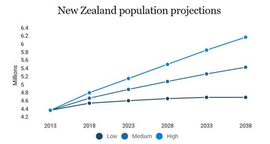 根據不同的生育率、死亡率和移民數字,新西蘭統計局(Stats NZ)的人口預測有高低不同的幾種方案。其中,走中間路線的預測被認為可信度最高——該預測稱,到2038年,新西蘭人口將達550萬。630萬的預測來自于“高”預測方案,預測基礎是高生育率、低死亡率和大量凈移入移民。“低”預測方案的估算人口則為480萬。