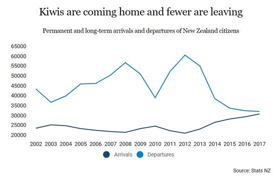 過去3年來,導致新西蘭凈移民數字增加的一大因素是,新西蘭人遷往海外的減少,回流的變多。21世紀以來,多數年份里新西蘭遷出人口和回流人口的凈差值都在20,000人左右,而過去3年,兩者的差值幾近于零。Glass相信,這是“另一塊拼圖”,“自2012年來,新西蘭的遷出人口數字一直處于下降之中,這使得原本用于?填補這一缺口的移入移民留下的難度加大。”