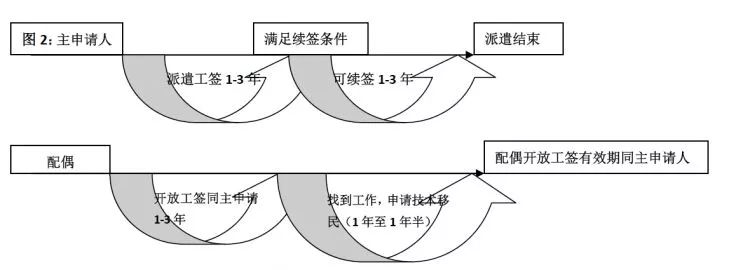ICT主申請人獲批派遣工簽后,配偶可直接申請開放工簽(有效期1-3年同主申請人)找到工作offer可直接獲得50分的加分!申請技術移民~對于打分不夠160分的技術群體!又不想去當地讀書的可以選擇先派遣,配偶拿開放工簽,找到工作申請技術移民!