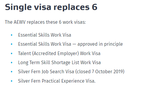 新西蘭移民局推出的全新簽證為Accredited Employer Work Visa(AEWV),即受認證的雇主擔保工簽。以簡化的單一簽證流程代替下列現有的6種工作簽證: