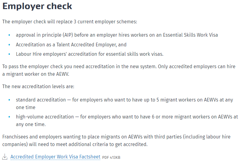 新AEWV簽證和相關的認可標準將于今年11月1日正式推出實行。雇主必須通過新的雇主認證獲得以AEWV簽證雇用移民的資格。這意味著,所有雇主,都需要先獲得一個認證資質,才可以擔保員工辦理工作簽證!