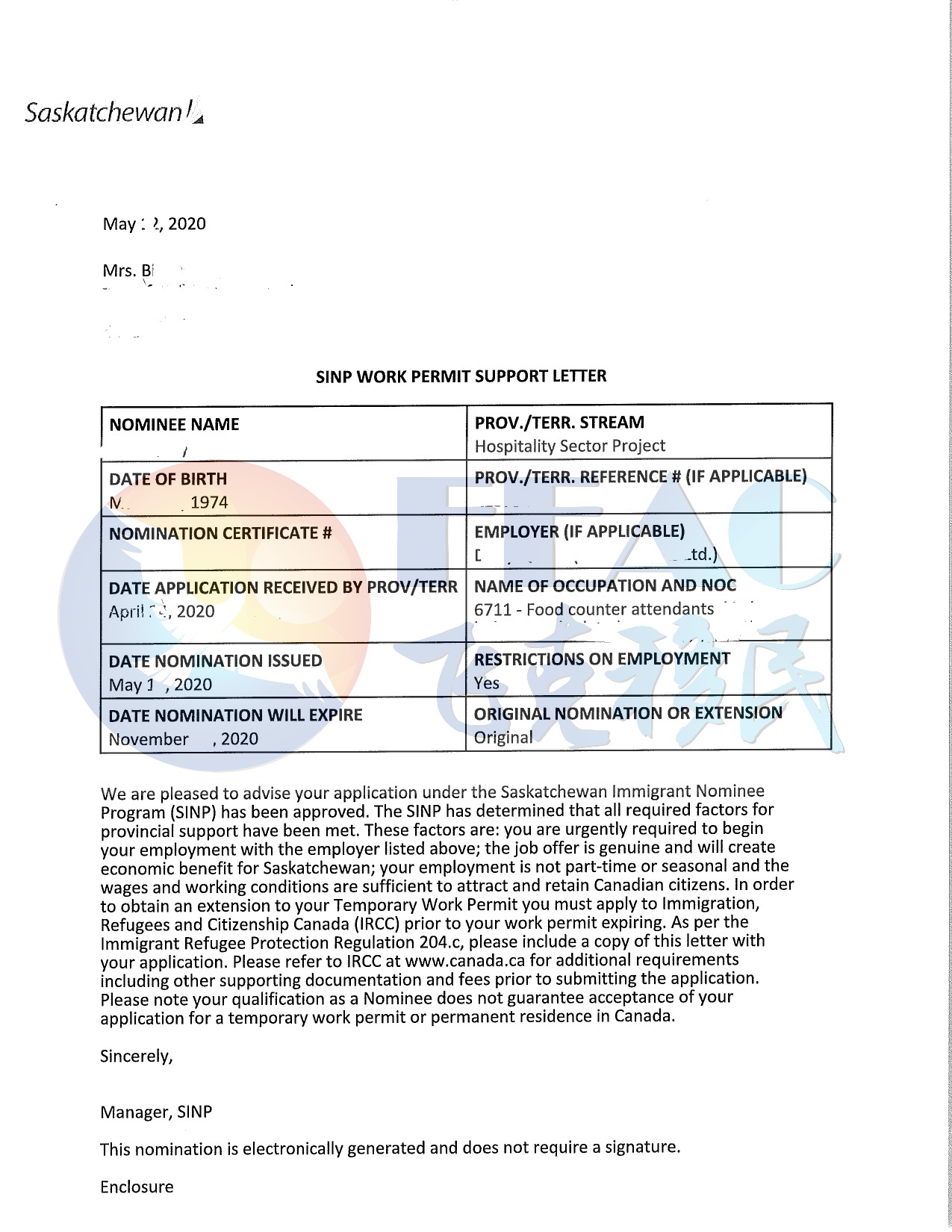 恭喜客戶薩省雇主擔保半技術提名書和工簽支持信獲批!