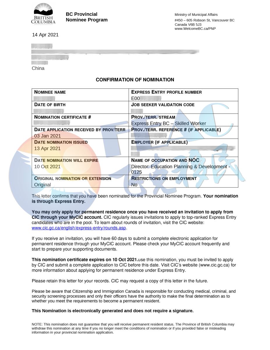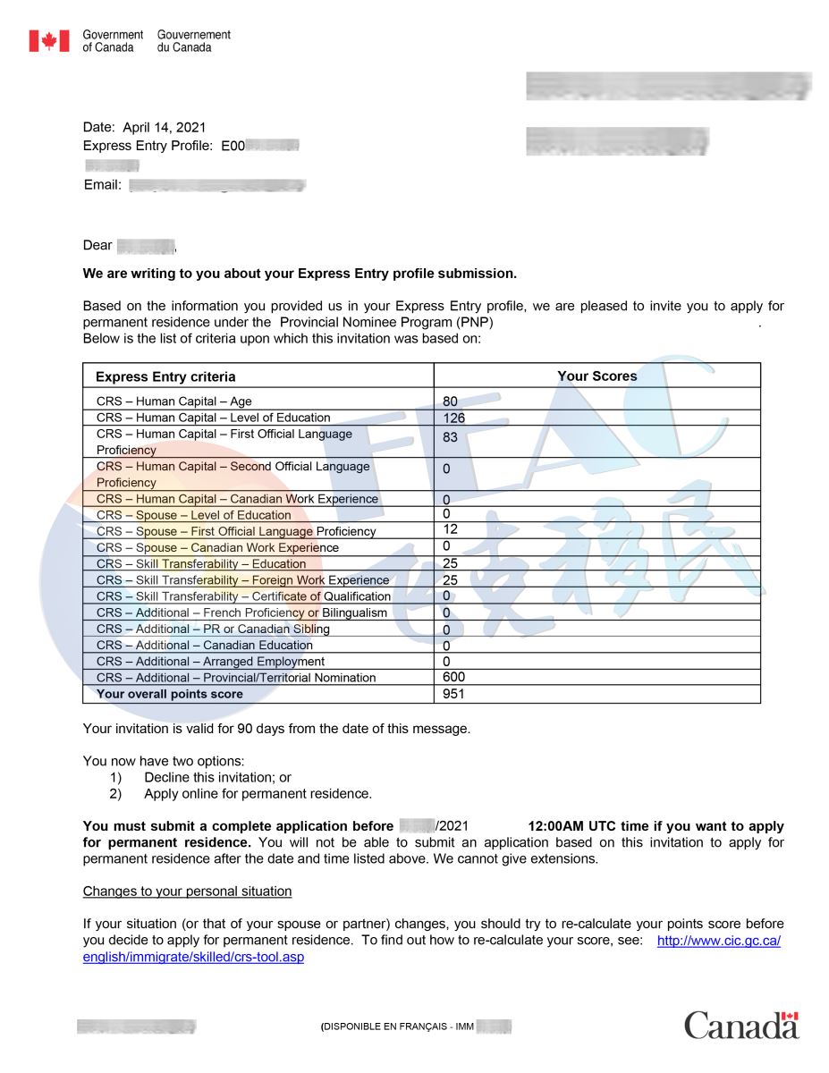 2020年12月8日注冊聯(lián)邦EE Profile 入池,2020年12月8日注冊EEBC SIRS入池(EEBC打分:113分), 2020年12月9日EEBC SIRS被抽中, 2021年1月4日遞交EEBC省提名申請, 2021年4月14日獲批BC省提名函, 2021年4月14日接受BC省提名函并額外加600分, 2021年4月14日獲得聯(lián)邦EE邀請信ITA(CRS 打分:951分)。