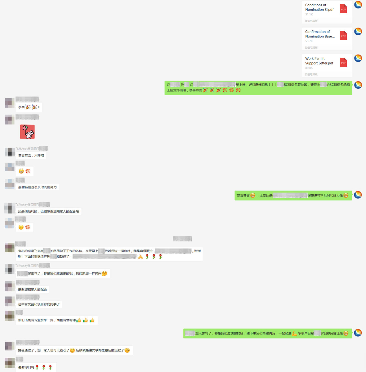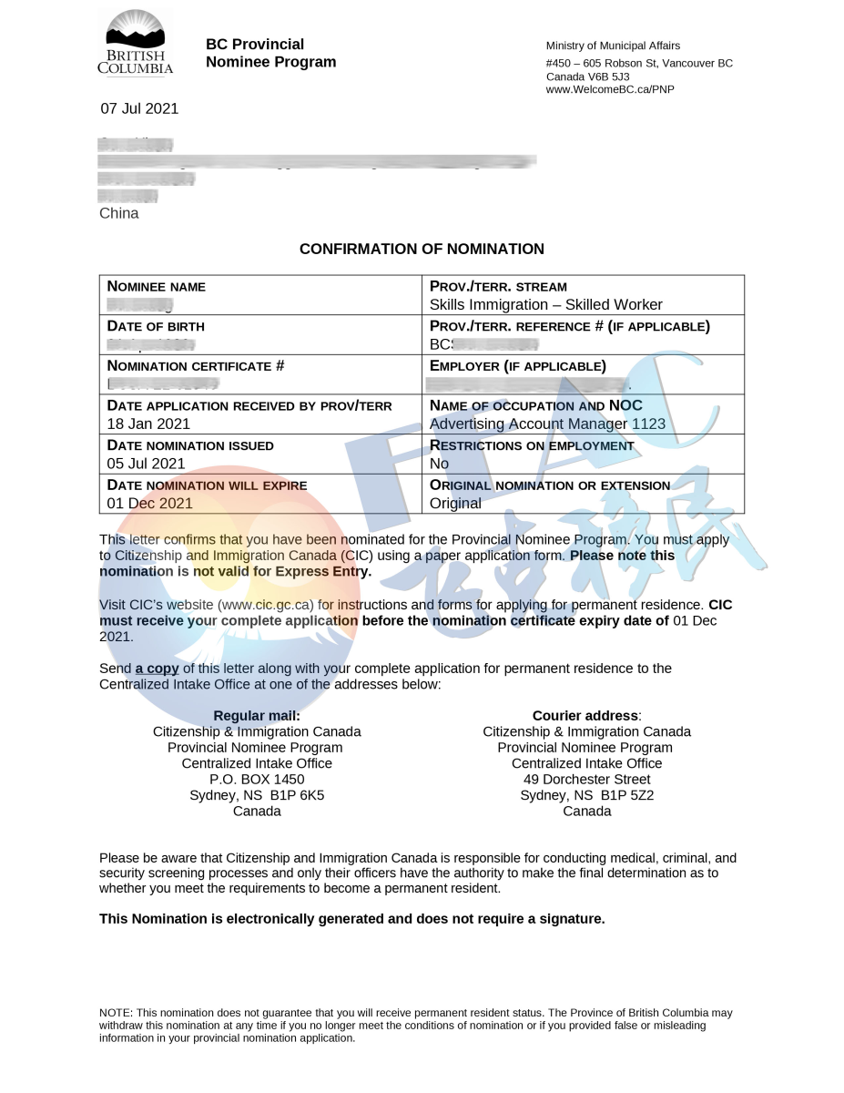 2020年12月23日注冊BC PNP SIRS入池(BC PNP:100分),2020年12月23日獲邀收到遞交全套BC雇主擔保省提名申請文件的信函,2021年1月18日遞交BC雇主擔保省提名申請全套文件,2021年7月7日獲得BC省提名函和工簽支持信。
