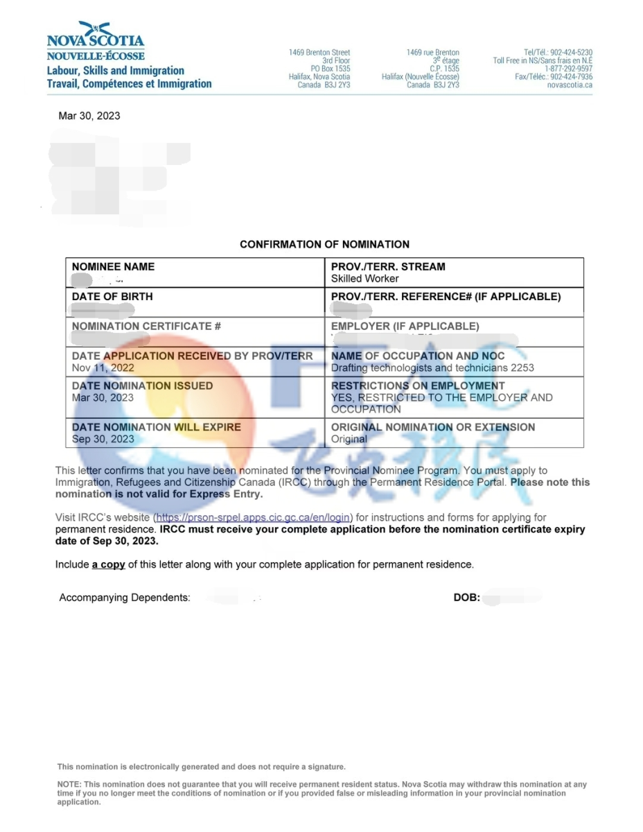 飛克幫客戶梳理個(gè)人情況,選中加拿大新省雇主擔(dān)保技術(shù)移民項(xiàng)目,在客戶的積極配合下,文案精心、仔細(xì)準(zhǔn)備了全套省提名申請材料,于2022年11月11日遞交全套省提名申請,2023年3月30日獲批省提名函!