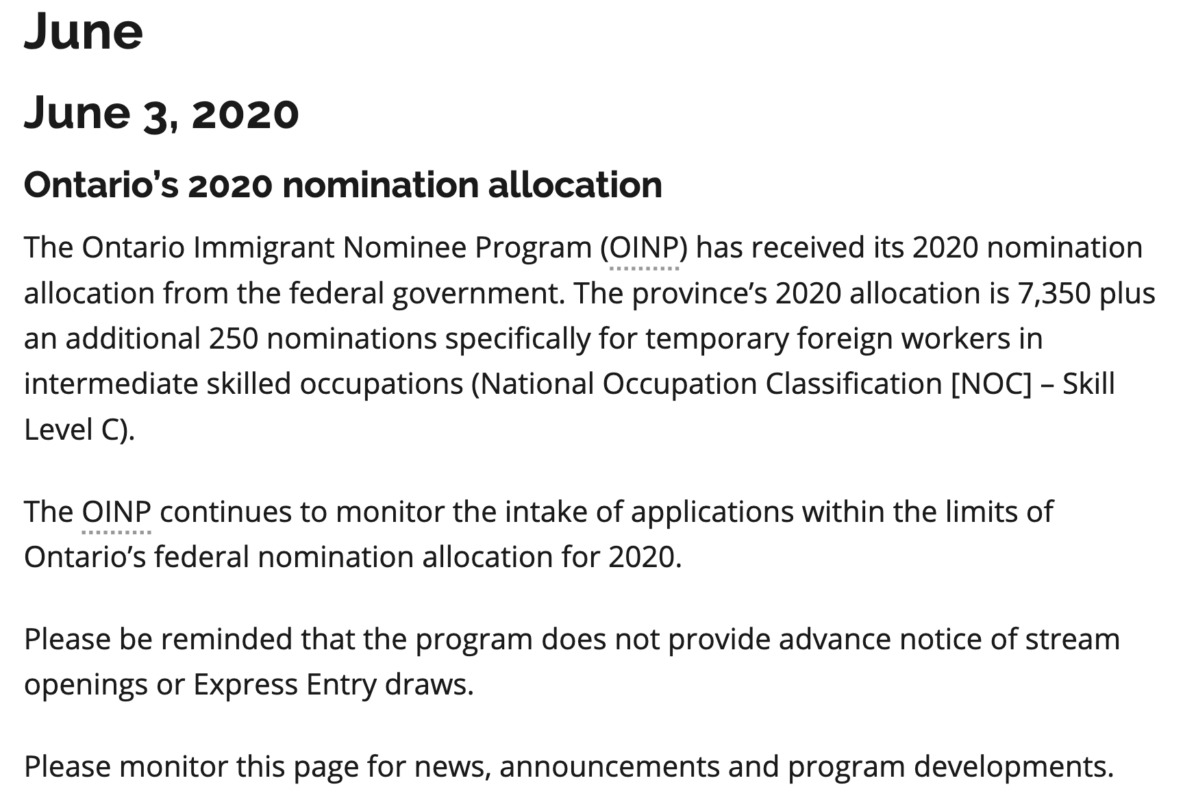 根據(jù)安省移民廳最新消息(6月3日),安省省提名計劃(OINP)已收到聯(lián)邦政府的2020年提名配額。