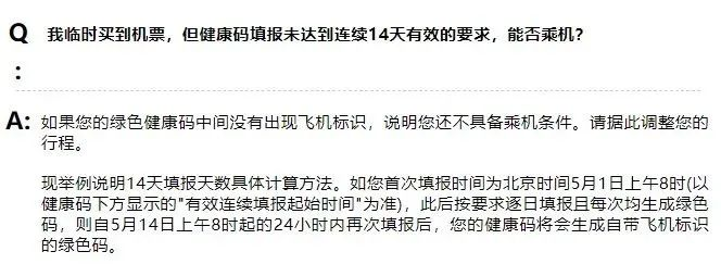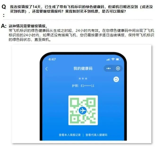 如果已經(jīng)生成了帶飛機(jī)標(biāo)識(shí)的綠色健康碼,但是乘機(jī)日期還沒(méi)到,也需要繼續(xù)填報(bào),直至乘機(jī)。