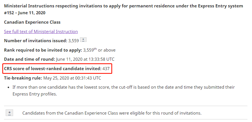 2020年6月11日,加拿大聯(lián)邦快速移民通道Express Entry發(fā)出了針對(duì)加拿大經(jīng)驗(yàn)類移民(CEC)的第152輪甄選。
