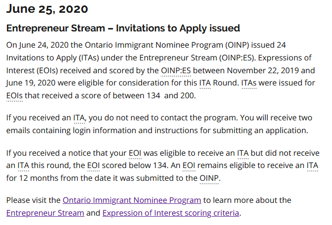 6月25日,安省移民廳公布最新一輪的安省企業家移民候選者抽簽,這次共同發出26份邀請函,比4月份抽簽人數幾乎保持一致,這次邀請者最低分為134分,最高分為200分。所有被篩選的申請者是在2019年11月22日至2020年6月19日遞交(EOI)申請意向書。