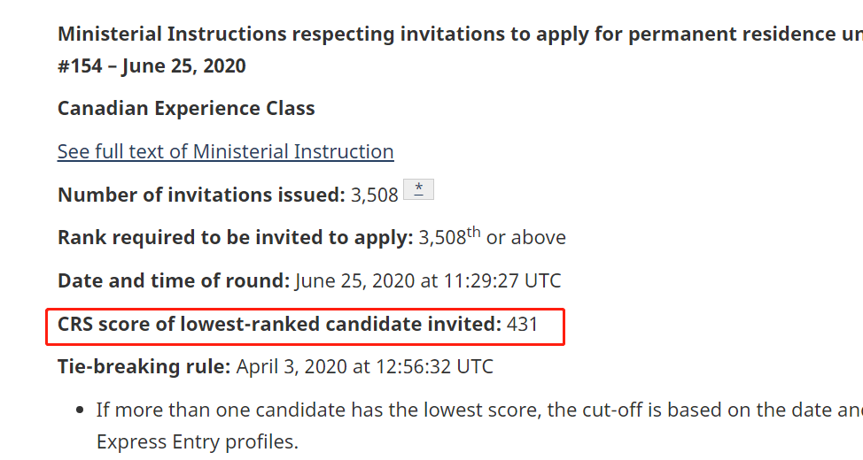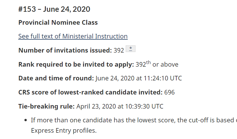 加拿大聯(lián)邦EE近日連續(xù)發(fā)出2次邀請,一次是6月24日發(fā)出的專門針對省提名PNP的,最低分696分(在目前的EE系統(tǒng)里,獲得省提名EE可以有600分的額外加分),邀請人數(shù)392位。一次是6月25日針對CEC加拿大經(jīng)驗類的,最低分431分,邀請人數(shù)3508位。