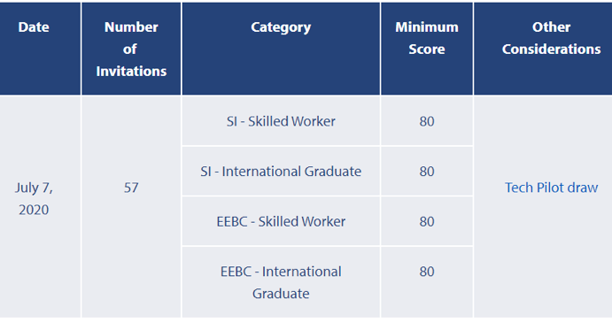 加拿大時間2020年7月7日,BC省省提名下的BCPNP Tech Pilot(高科技/文創行業試點項目)發布了最新一輪的邀請,本輪各通道的最低邀請分均為80分,共發出57份邀請!