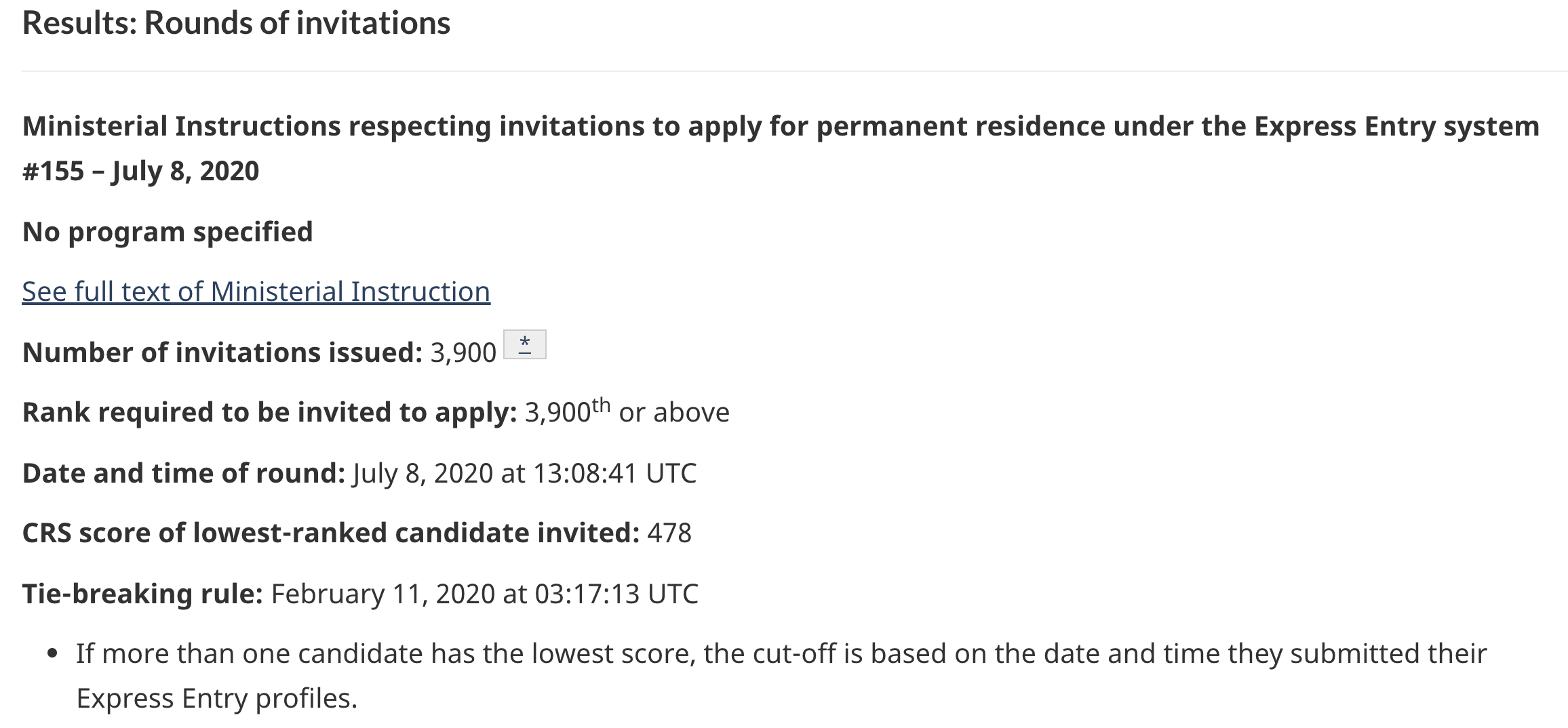 2020年7月8日,加拿大聯邦快速移民通道ExpressEntry發出了第155輪抽分,本輪是加拿大移民局自3月4日以來首次向聯邦技術移民FSWP和技工移民類FSTW申請人發出邀請。這標志著加拿大移民局正在恢復向境外人士發出移民邀請(ITA)。此次,邀請分數478分,邀請人數3900人。
