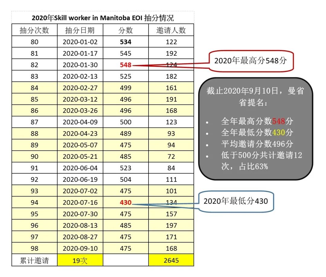 目前曼省省提名每兩周一次抽分,共計邀請19次。目前平均邀請分數496分,最低一次僅430分。500分以下的邀請次數占63%。