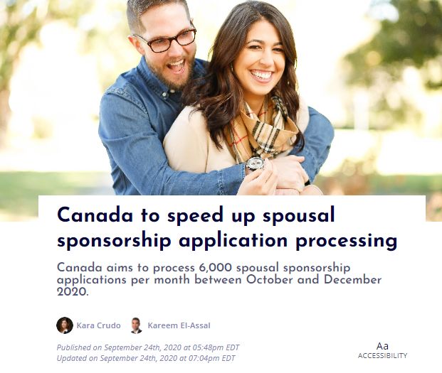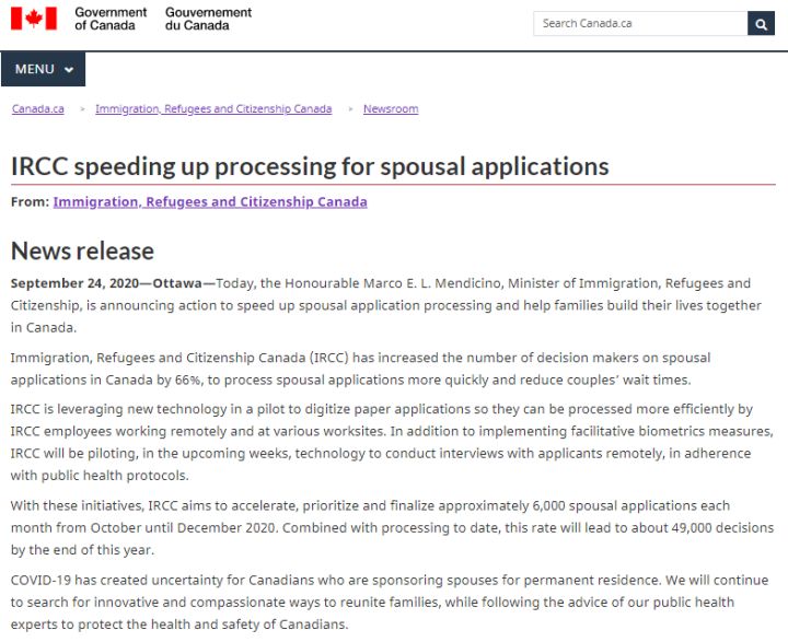加拿大當地時間2020年9月24日,加拿大移民部長Mendicino宣布,鑒于目前移民審批的速度較慢,為了幫助更多的家庭、配偶早日在加拿大團聚,移民部(IRCC)從即日加速配偶申請的審核速度。