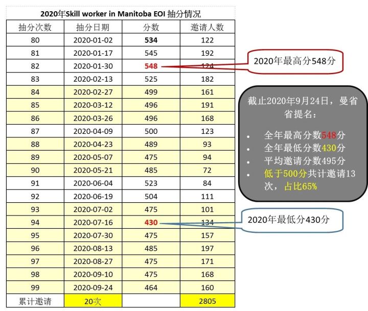 截止到2020年9月24日,曼省省提名每兩周一次抽分,共計邀請20次。目前平均邀請分數495分,最低一次僅430分。500分以下的邀請次數占65%。