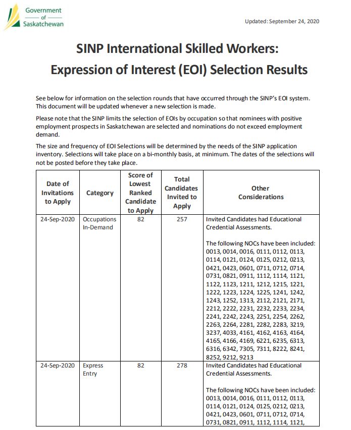 加拿大當地時間2020年9月24日,薩省技術移民無雇主類別又進行了新一輪的邀請。EE類別共發出278份邀請,最低分數82分;緊缺職位OID類別共發出257份邀請,最低分數82分;