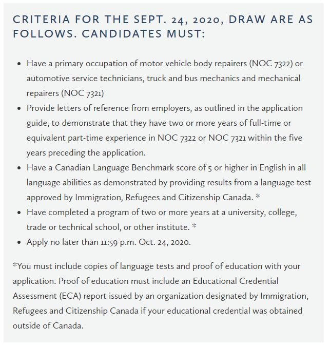 本次省提名邀請主要是針對職位為NOC7322汽車車車身維修工或NOC7321汽車維修技師,卡車和公共汽車力學和機械維修工的候選人。