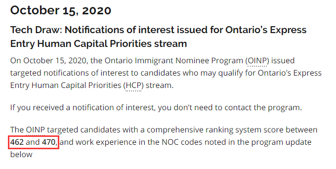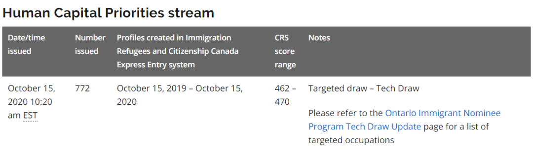 加拿大當地時間2020年10月15日, 安省技術移民無雇主類別發布了新的EOI篩選結果,此次邀請了符合EE快速通道優才類別的IT技術人才,最低邀請分數462分,邀請人數772人。