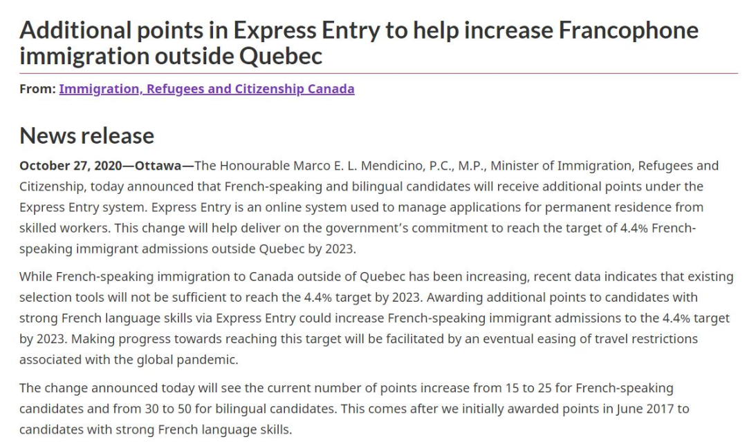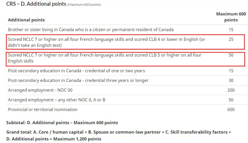 加拿大移民局公布針對(duì)快速移民通道Express Entry的新政策,法語(yǔ)語(yǔ)言成績(jī)達(dá)到NCLC 7的申請(qǐng)人可以獲得最高達(dá)50分額外加分。