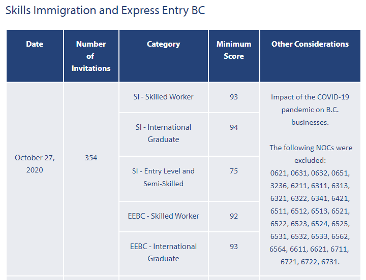 加拿大時(shí)間2020年10月27日,BC PNP發(fā)出了最新一輪常規(guī)邀請(qǐng),分?jǐn)?shù)未發(fā)生改變,邀請(qǐng)人數(shù)下降,本輪共354人獲邀。