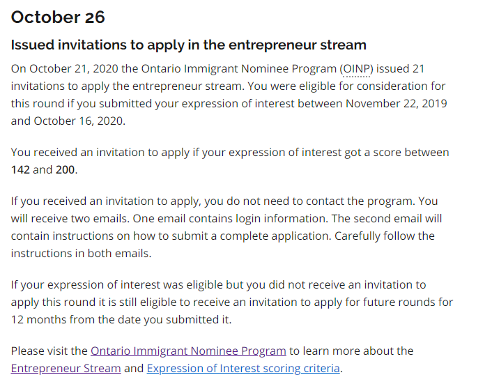 加拿大當(dāng)?shù)貢r(shí)間2020年10月21日,安省移民廳(OINP)再次對(duì)企業(yè)家移民(Entrepreneur stream)發(fā)放了省提名邀請(qǐng)。本次共發(fā)放21份邀請(qǐng),邀請(qǐng)分?jǐn)?shù)為142-200分之間。
