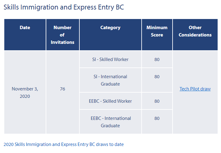 加拿大當(dāng)?shù)貢r(shí)間11月3日,BC PNP Tech Pilot最新結(jié)果公布進(jìn)行了本月首輪抽選。本輪的Tech pilot各項(xiàng)分?jǐn)?shù)依舊保持在80分,邀請(qǐng)人數(shù)為76人。