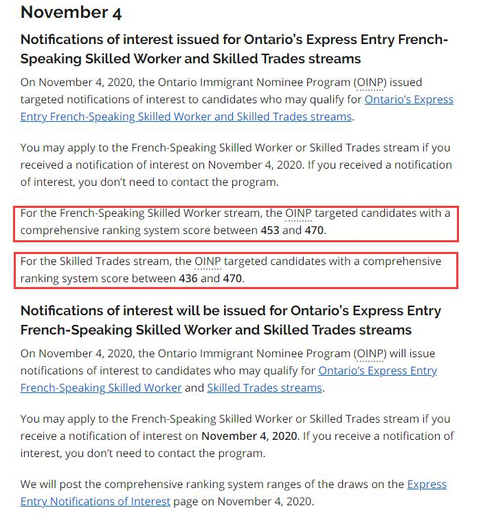 加拿大當地時間2020年11月4日,安省省政府OINP同時發出2個移民類別邀請,分別是法語類別 French-Speaking和技工類別 Skilled Trades。