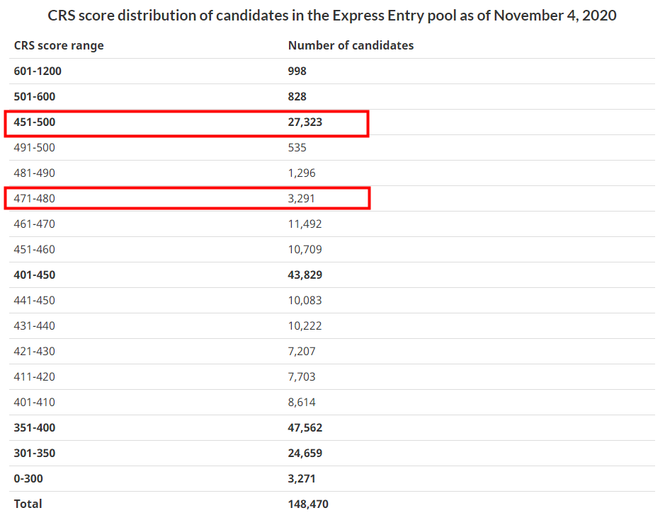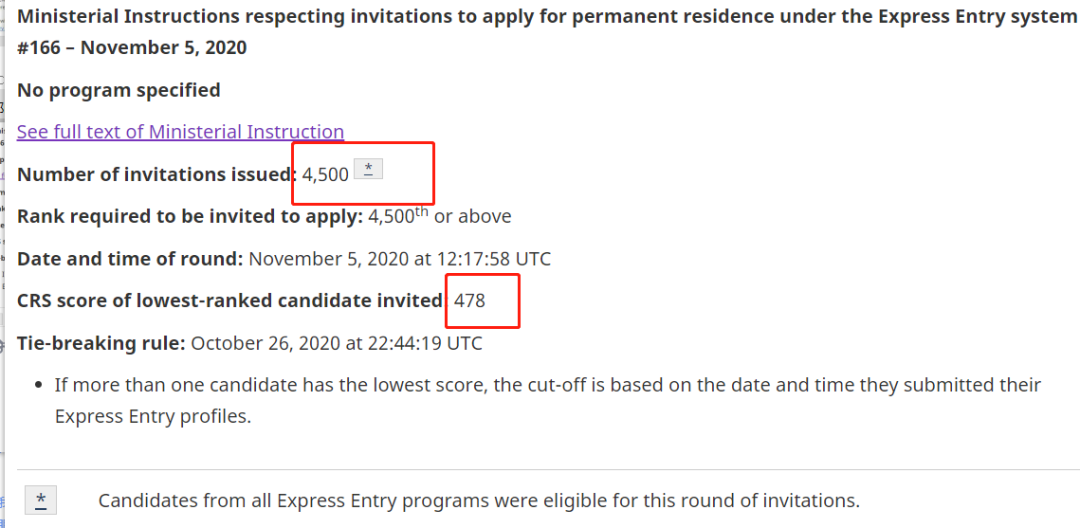 加拿大當地時間2020年11月5日,Express Entry (EE)快速移民通道進行了本月首輪全類邀請(No program specified),本輪共計4500人獲邀,最低邀請分數478分。