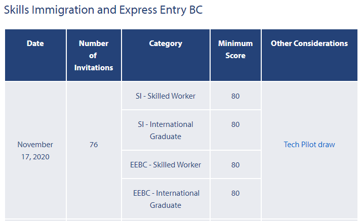 加拿大當地時間11月17日,BC PNP Tech Pilot發放最新一輪抽分結果。本輪的Tech pilot各項分數依舊保持在80分,邀請人數為76人。