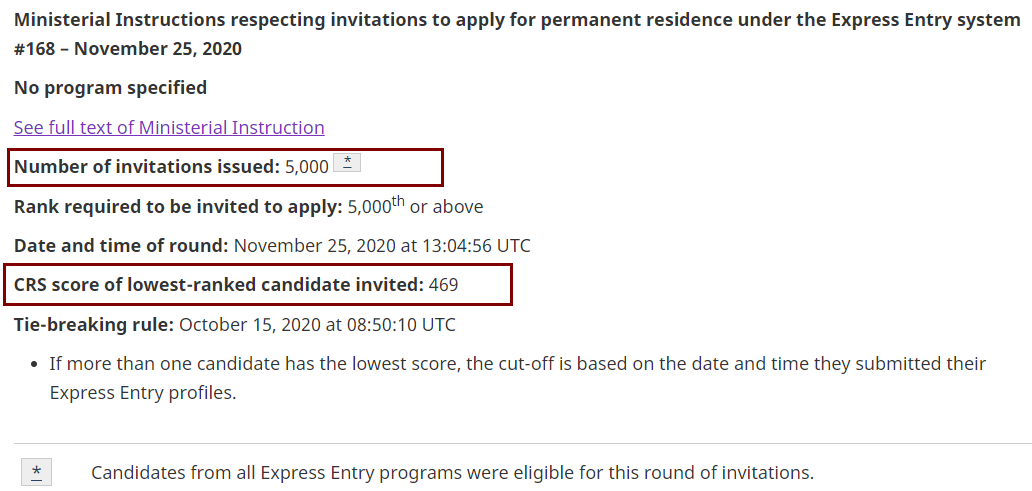 加拿大當地時間2020年11月25日,移民局再發邀請,過往通常都是2周邀請一次,這次只間隔了一周。