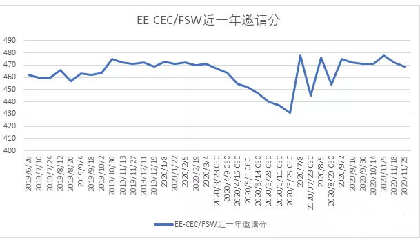 2020年至今EE邀請曲線如下(該曲線不包含PNP),可以看到從3月份以來,邀請分數在垂直下降,直到上次7月8日的合并邀請,分數飆升到478分。