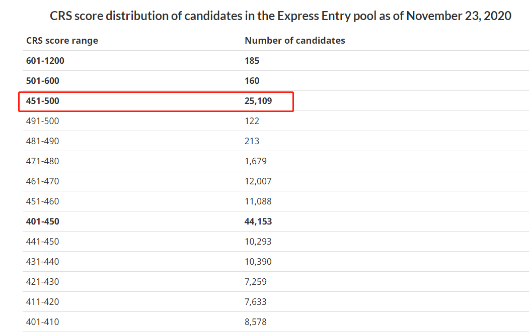 移民局也更新了截止11月23日EE系統的候選人情況,可以看到451分以上的還有2.5萬人左右。這類申請人主要是海外技術移民。可以預計疫情后海外申請人的分數競爭仍然會很激烈。
