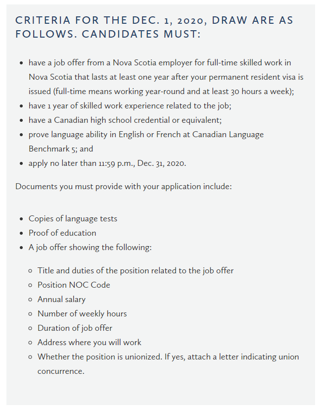 本次省提名邀請主要針對有新省雇主提供的全職job offer,在獲得PR身份后至少持續一年,與該工作相關的熟練工作經驗,并且具有加拿大高中學歷或同等學歷,法語或英語能力達到CLB5的申請人。
