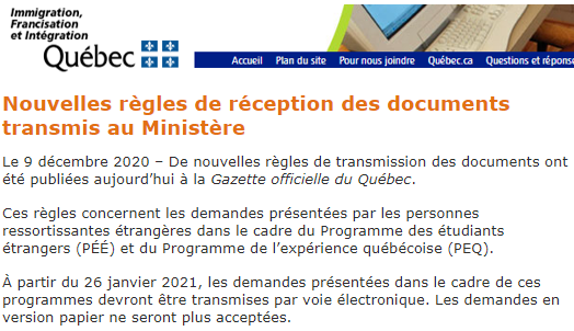 12月9日,魁省官方正式宣布從2021年1月26日開始,魁省國際學生項目和魁省經驗類移民將不再接受紙質申請,都需要使用Arrima平臺上傳遞交申請文件。