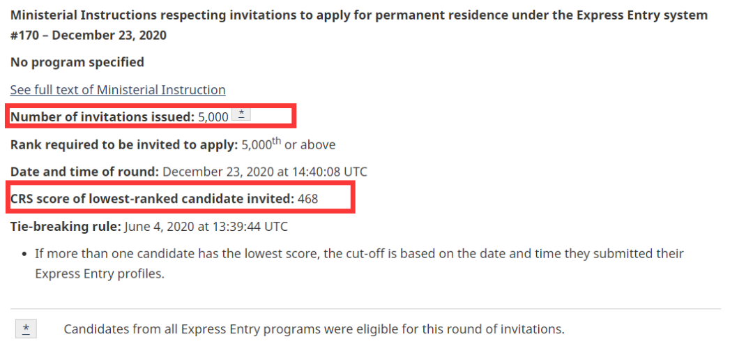 加拿大當地時間2020年12月23日,加拿大聯邦快速通道發(fā)出了第170次針對所有類別邀請,這也是2020年最后一輪邀請。