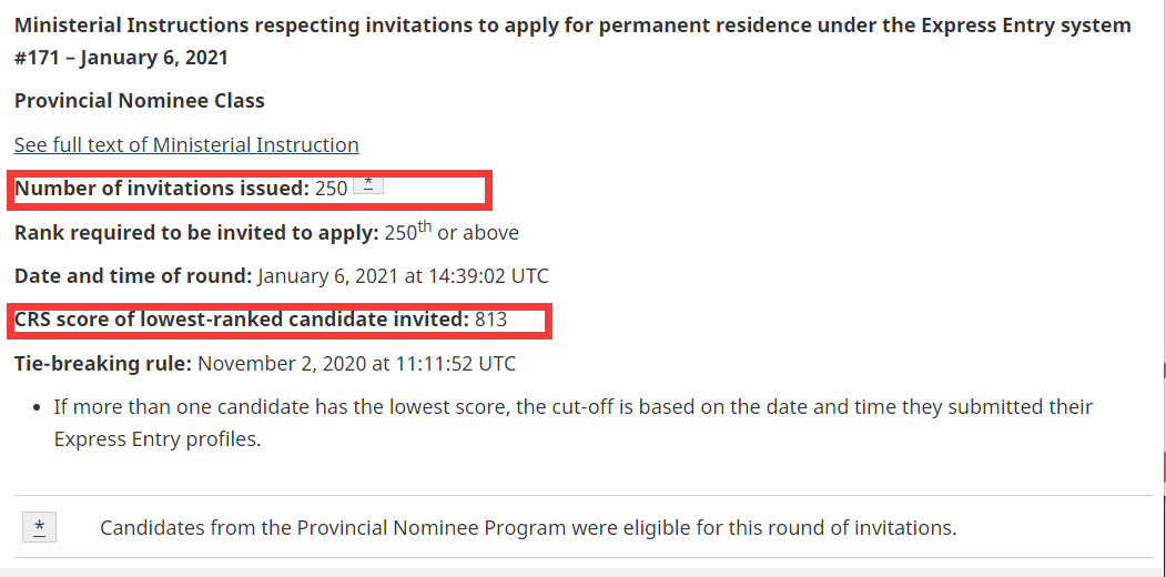 加拿大當?shù)貢r間2020年1月6日,加拿大聯(lián)邦EE發(fā)出了第171次邀請。本輪邀請僅針對指定類別(PNP省提名類別),這是2021年新年第一邀。