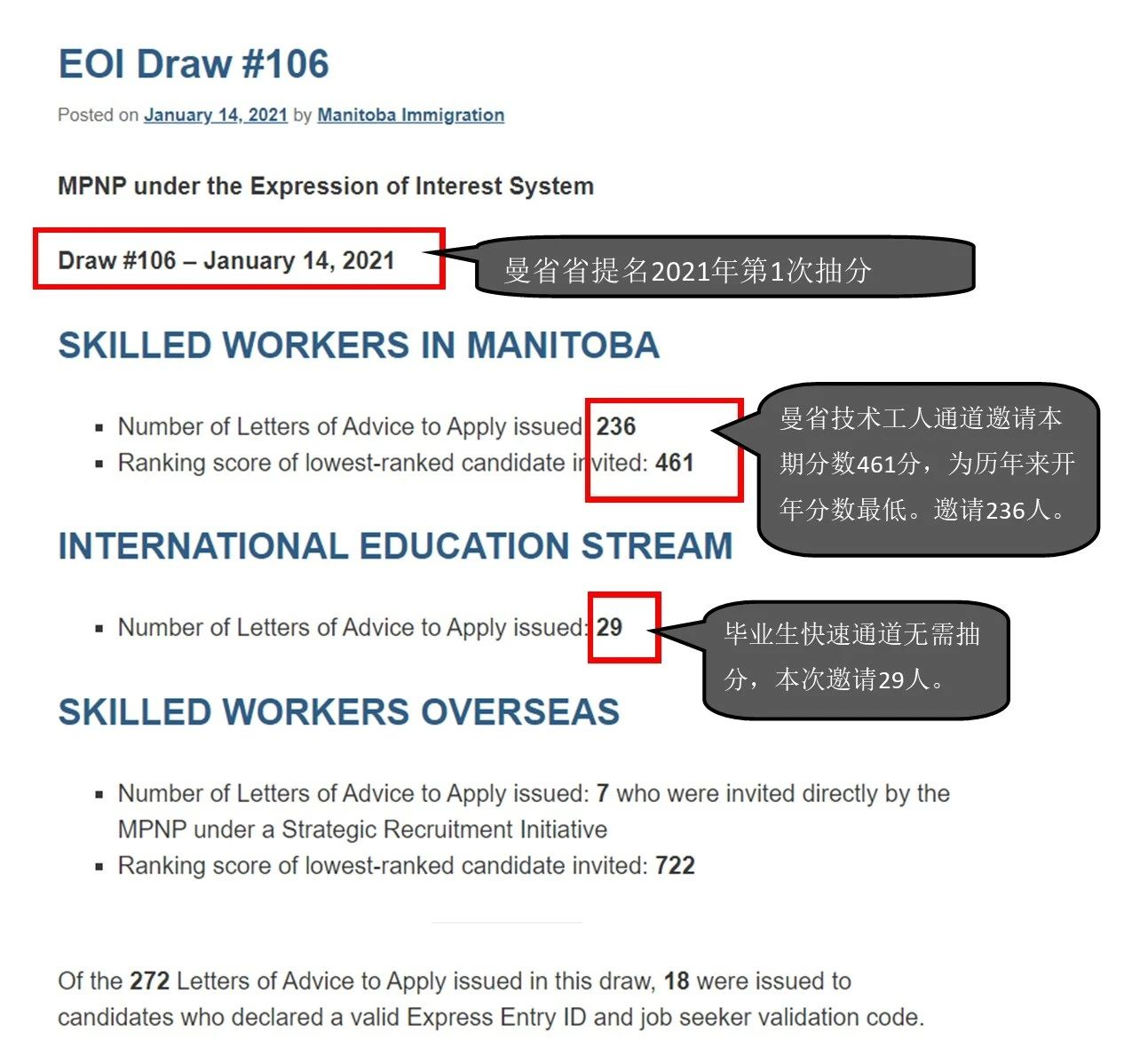 本期曼省技術工人類別共計邀請236位申請人,邀請分數為461分。分數和上輪一樣保持不變,依然低于500分。創下了歷年來開年邀請的低分之最。