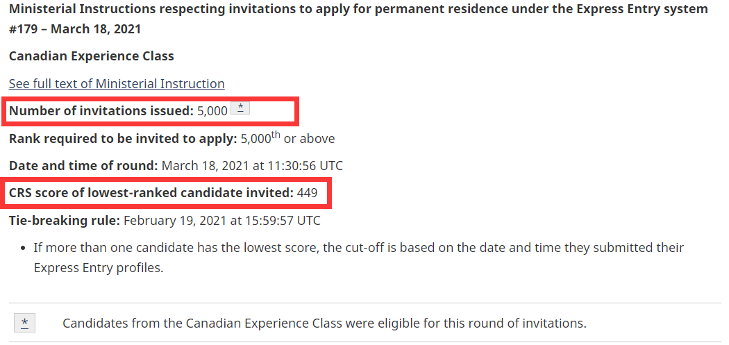 本次邀請只針對CEC經驗類移民申請人,共邀請5000人,最低分449分。需要在2021年2月19日15點前進入候選池。