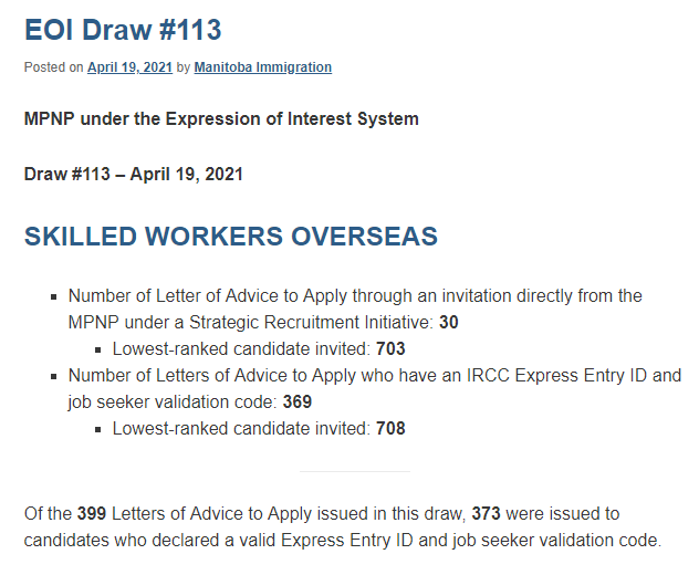 曼省戰略招聘計劃項目發出了30份建議書(LAA),其中最低邀請分數為703分;