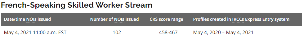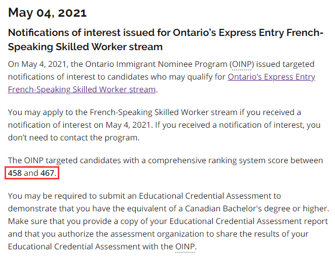 加拿大當地時間2021年5月4日,安省省政府OINP對EE法語技術工人類別( French-Speaking Skilled Worker stream)發出新一輪的移民邀請,本次距離上次法語類別的邀請已經一個月。