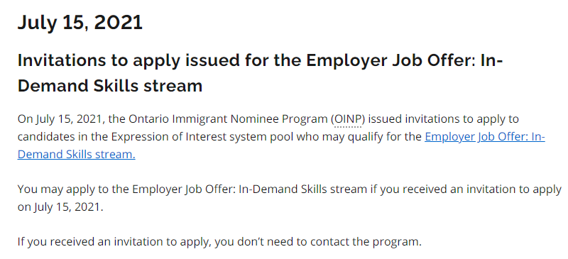 2021年7月15日安大略省移民局通過省提名項目向興趣表達系統的候選人發出了邀請。