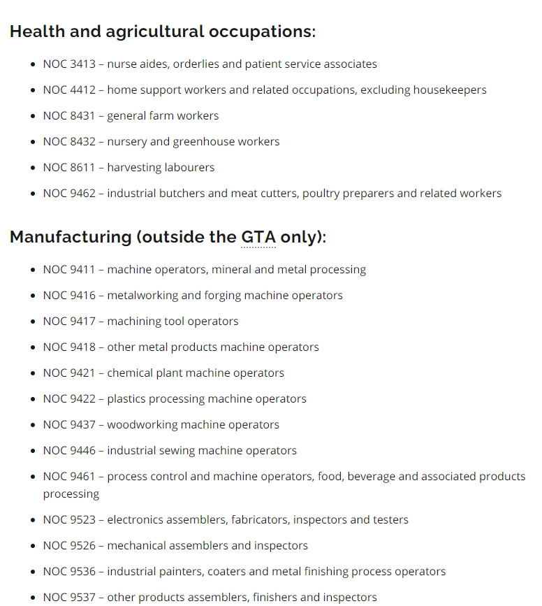 其中制造業僅限GTA以外,如果申請人在 2021 年 7 月 15 日收到申請邀請,可以申請雇主擔保緊缺職業類別,且無需聯系the program。