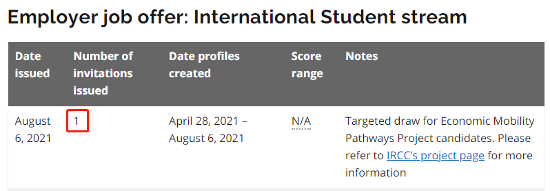本輪安省向雇主擔保項目國際學生類別發放了1份邀請,也是針對EMPP項目的申請人發放。