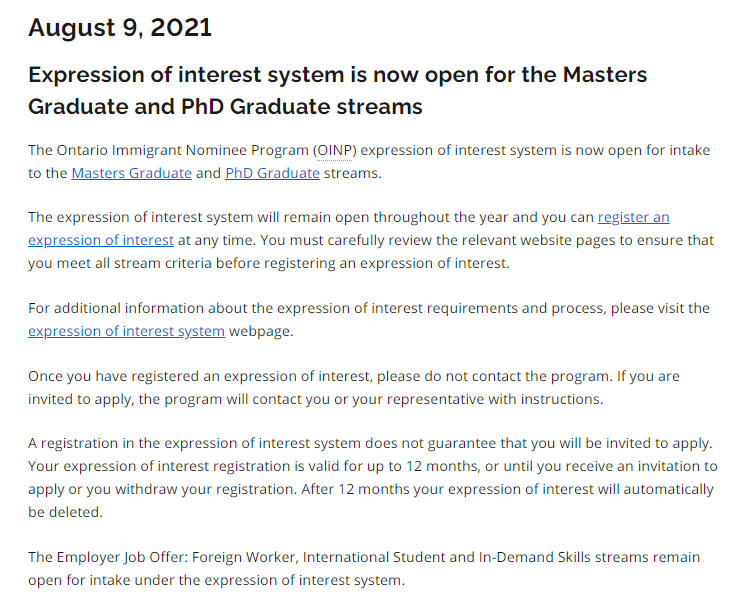 加拿大時間8月9日,安省宣布開放碩博類省提名EOI申請。在EOI系統中注冊并不能保證會被邀請申請,EOI注冊有效期最長為 12 個月,或者直到收到申請邀請或撤回注冊為止。如果12 個月內未受到邀請,意向書將會被自動刪除。