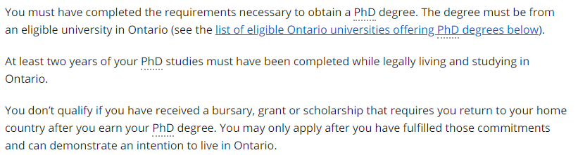 ?持委培獎學金的碩博類畢業生不能申請,除非履行了委培協議并展現在安省的居住意圖。