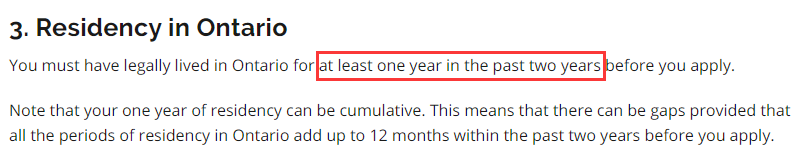 申請人必須在申請前的兩年中,累計至少有一年居住在安省。