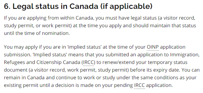 申請人在境內提出申請時,必須以合法身份居住在安省,包括持學簽、工簽或VR,并應保持該身份直至提名。